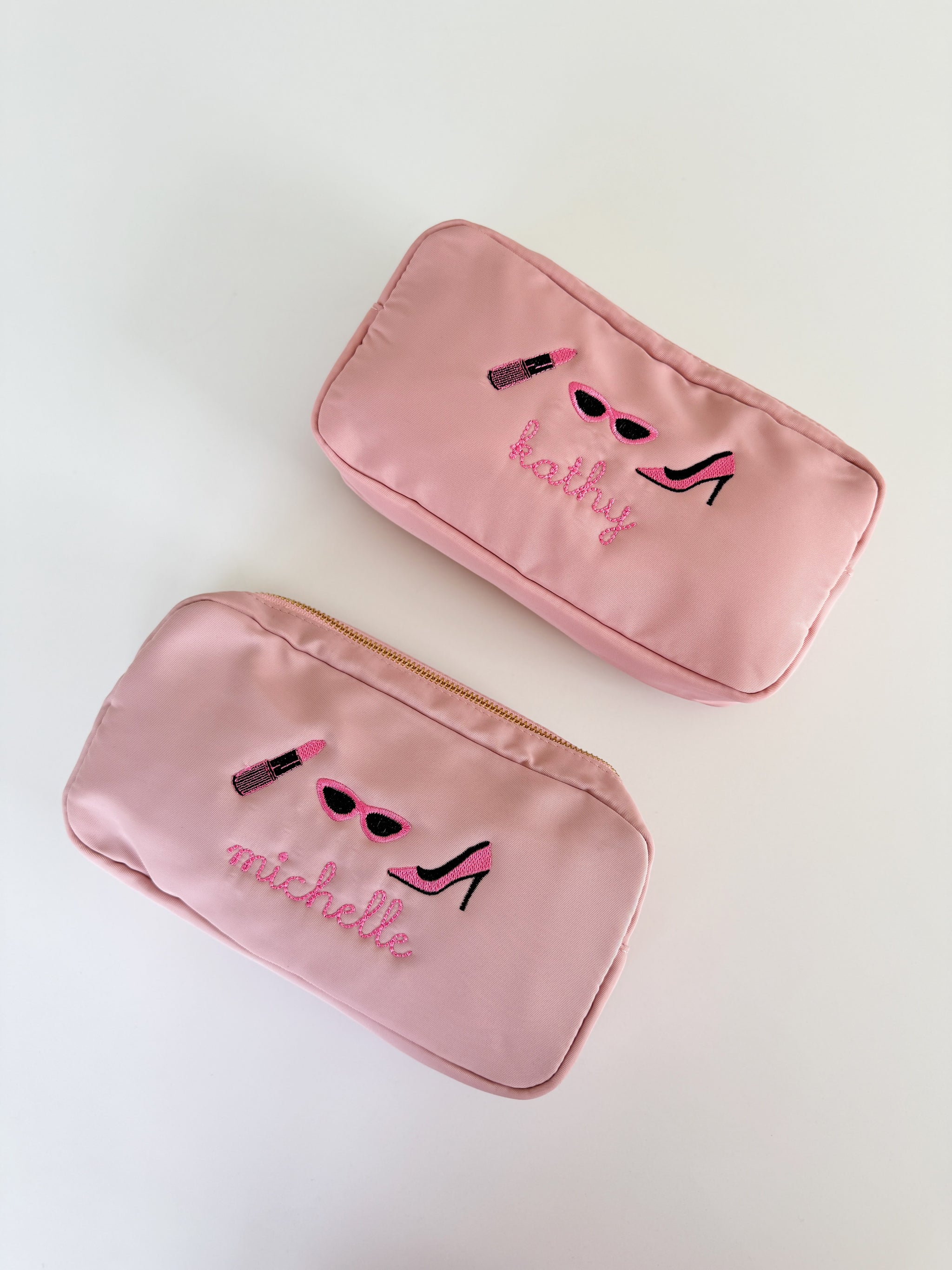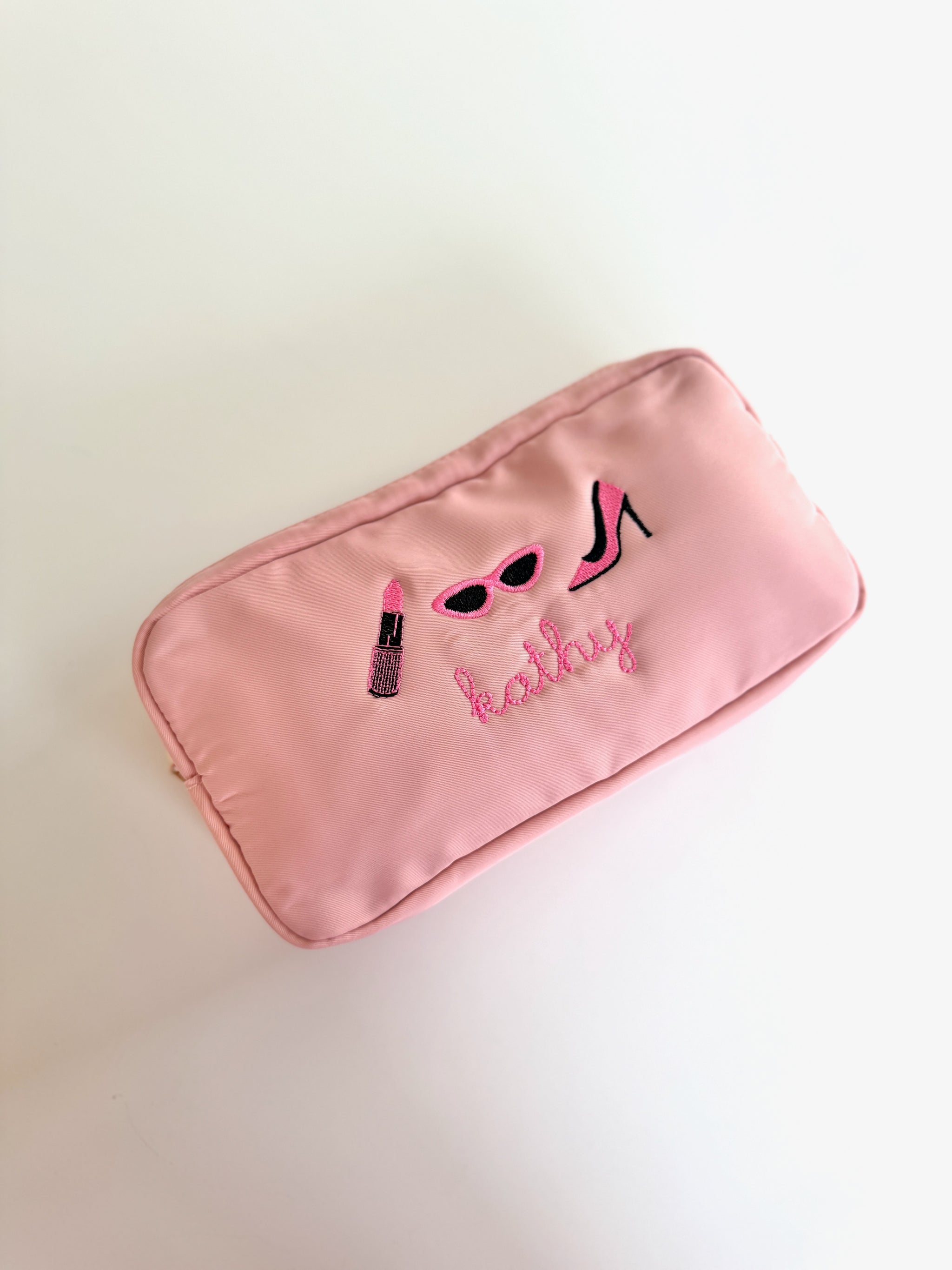 A medium pink zippered pouch with stitched with Barbie inspired accessories & personalized with your choice of text. Icons include a Barbie inspired lipstick, sunglass & stiletto.