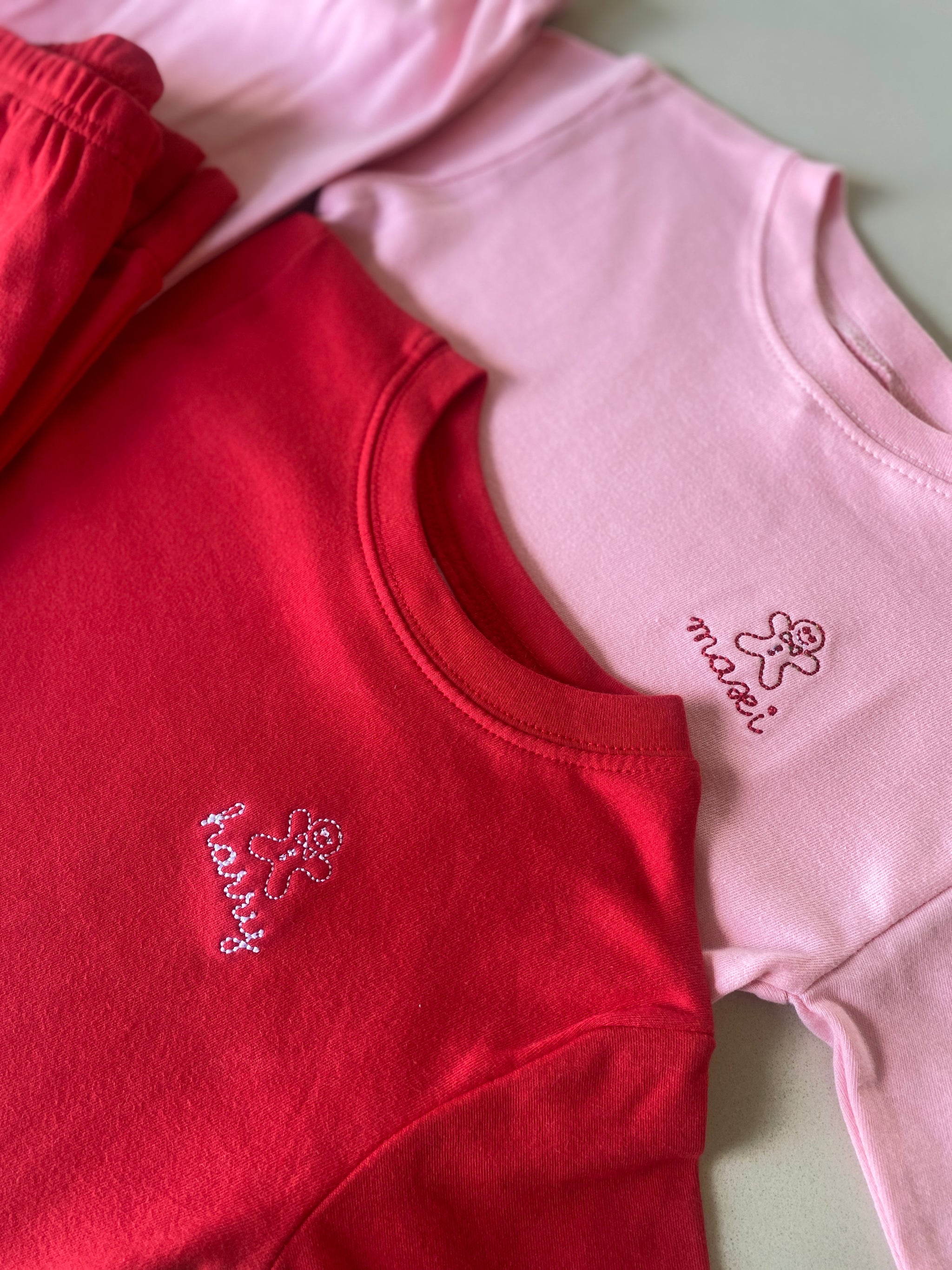 The Gingerbread Cookie Pajama Set is embroidered with a gingerbread cookie icon and can be personalized with a name. A cotton-blend two-piece set designed for Christmas celebrations, family photos, or gifting.