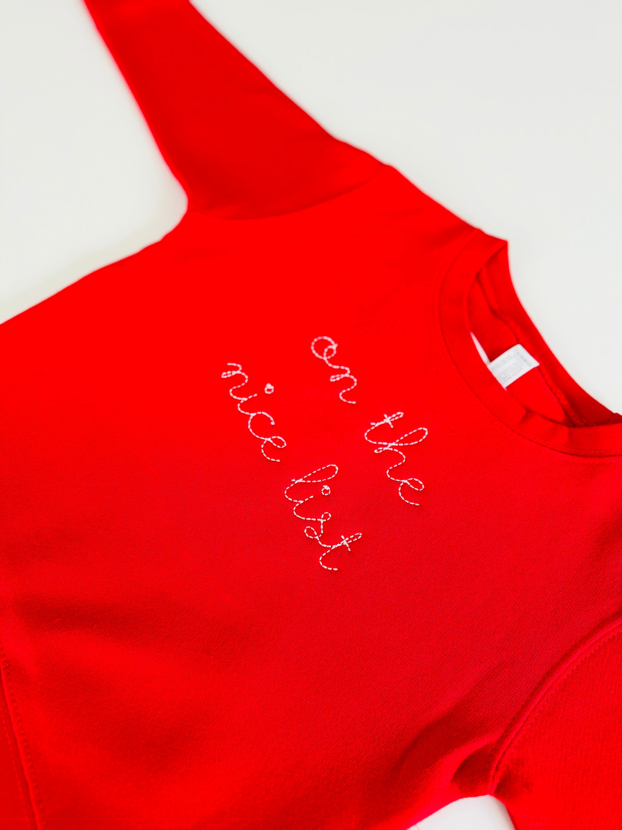 The Naughty or Nice Crewneck is pre-embroidered with your choice of “on the nice list” or “on the naughty list.” A festive cotton-blend fleece sweatshirt designed for holiday photos, gifting, and cozy winter days.